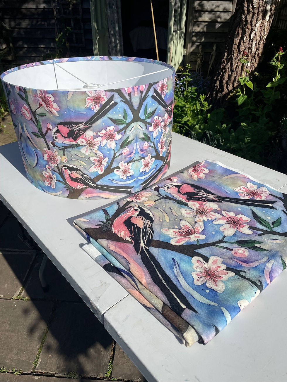 I use Cotton sateen fabric printed with my original batik design & repeating mirror image of a flock of long tailed tits in a silver birch tree in winter. Available to fit a UK/continental lamp base or ceiling light. The fabric is stuck to a PVC former to make the drum & has metal rings top & bottom.I make each lampshade to order and is available in 20cm diameter and 30cm diameter shade.